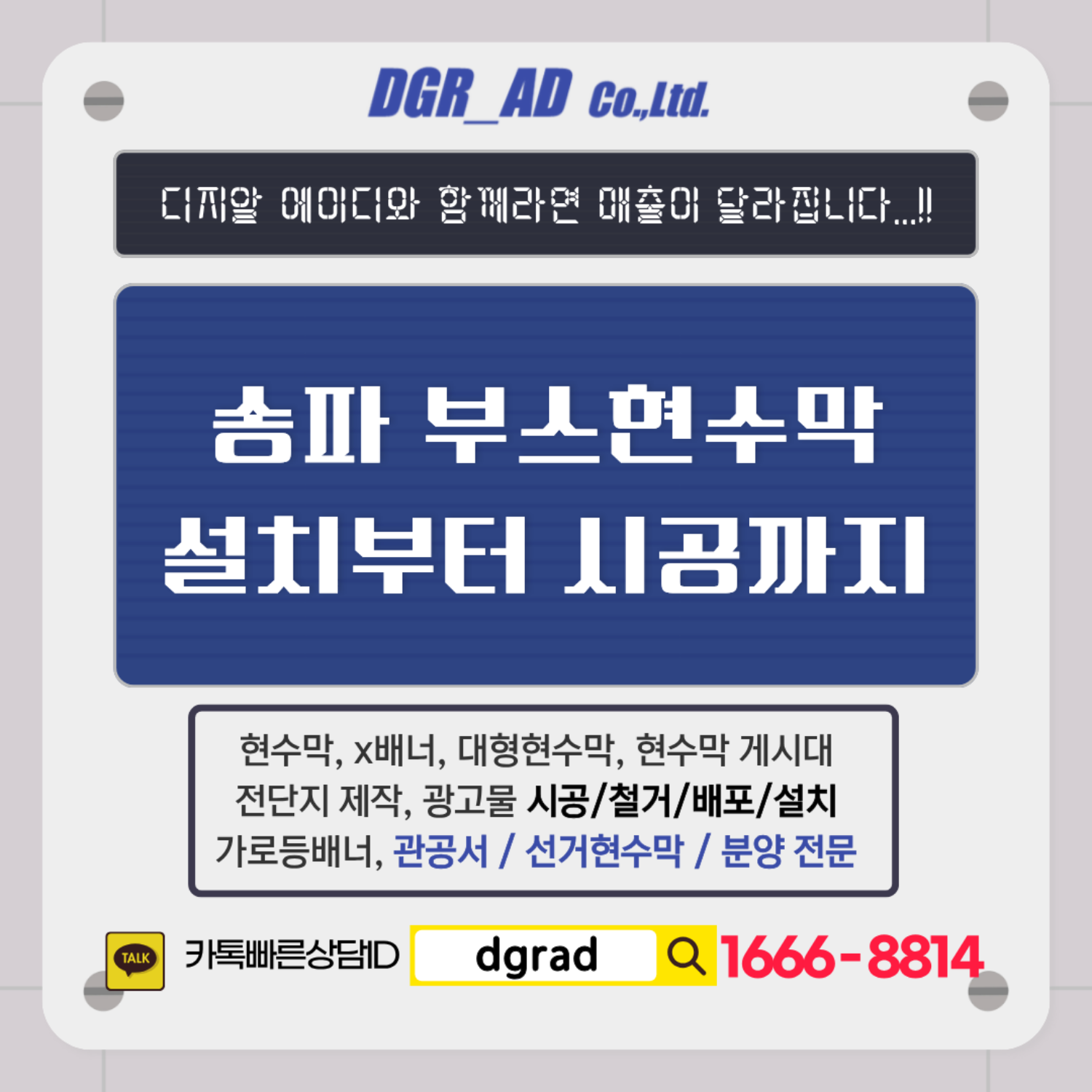 송파 부스현수막 광고에서 ‘설치부터 시공까지’라는 문구는 매우 중요합니다. 전시회 부스는 단순히 현수막을 ‘설치’하는 것이 아니라, 부스 프레임(조립식)이나 목공 구조물(목공 부스)에 맞춰 광고물 전체를 ‘시공’하는 작업입니다.