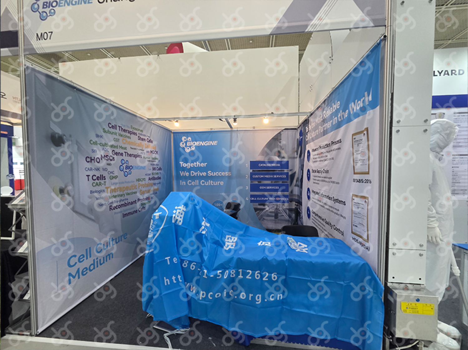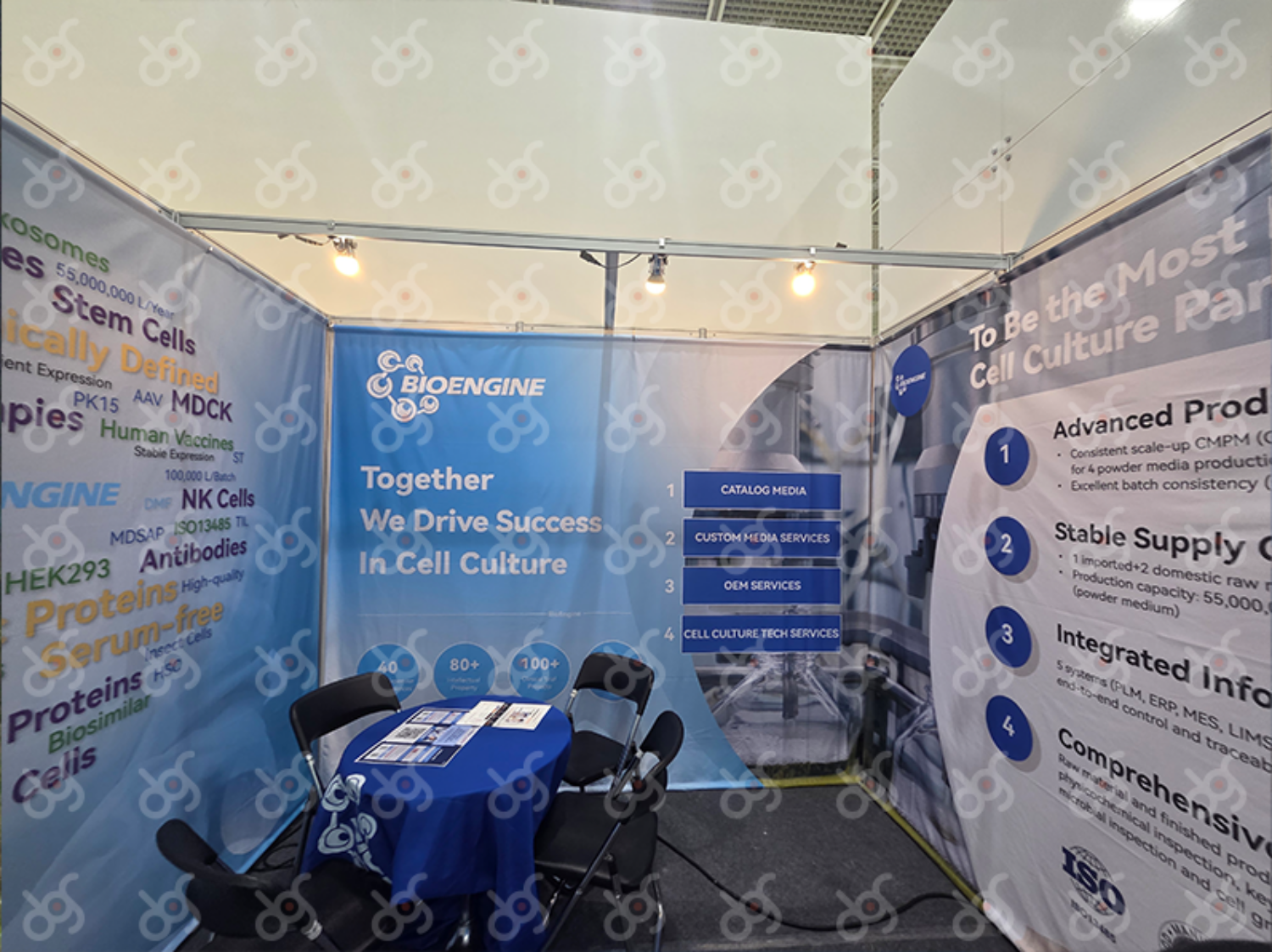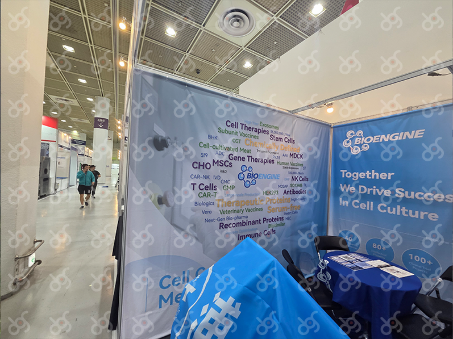 ‘CA BIOENGINE’ 부스 내부의 완성된 모습입니다. 상단의 스포트라이트 조명을 받고 있음에도, 현수막 면에 ‘빛반사(글레어)’가 거의 없습니다.