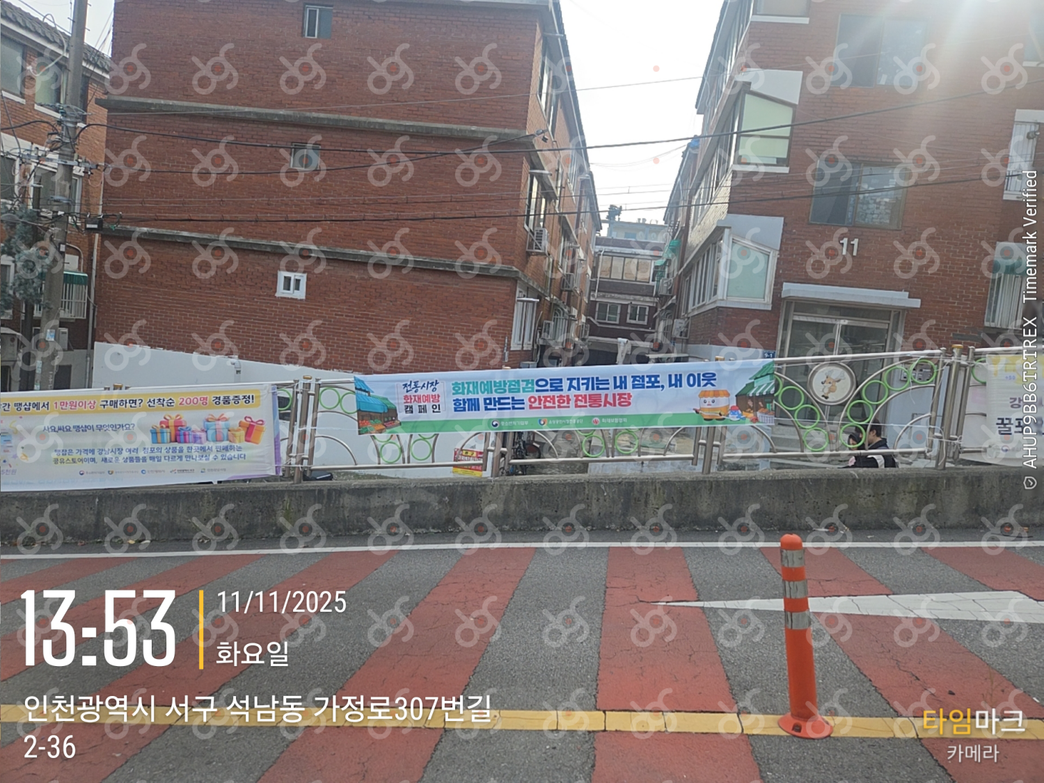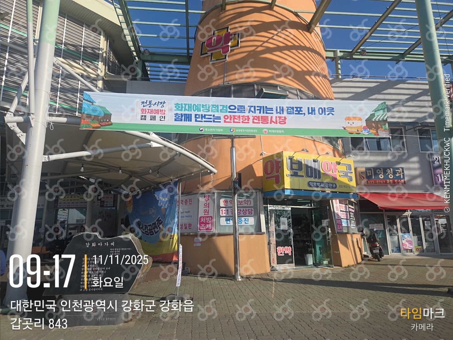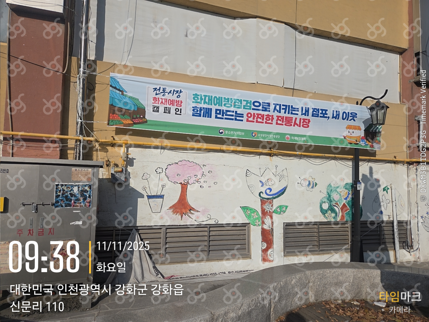 이제 실제 ‘전통시장 화재예방 캠페인’ 시공 현장입니다. 2025년 11월 11일 화요일 오전 09시 17분, 인천 강화군 강화읍 갑곶리.