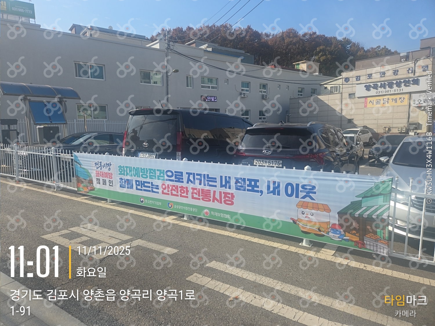 오전 11시 01분, 이번엔 경기도 김포시 양촌읍입니다. 이 캠페인이 인천 지역뿐만 아니라, 인근의 김포시 전통시장까지 확장되어 진행되었음을 보여줍니다. 펜스에 설치된 현수막은 보행자의 눈높이에 정확히 맞춰져, 메시지 전달 효과를 극대화합니다.