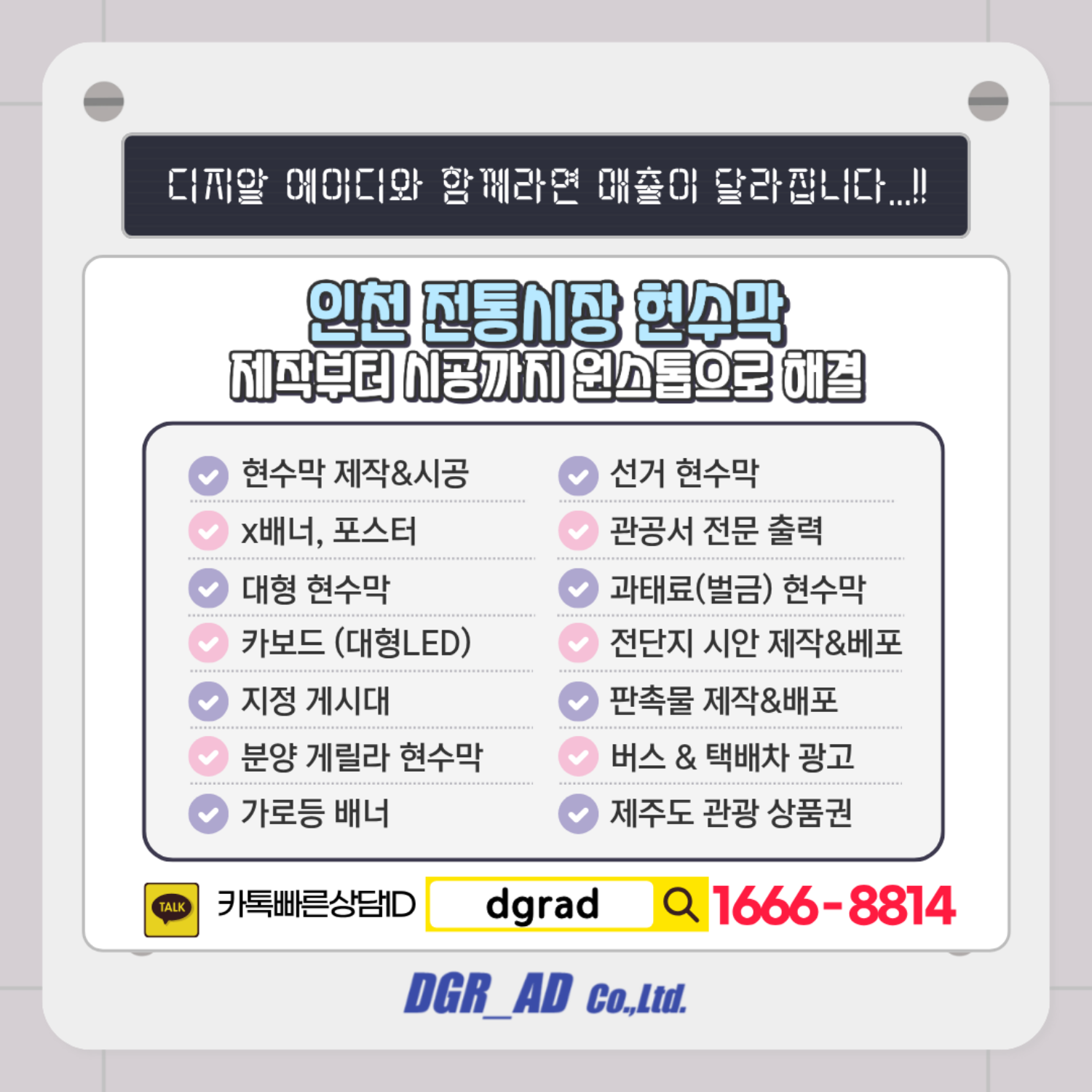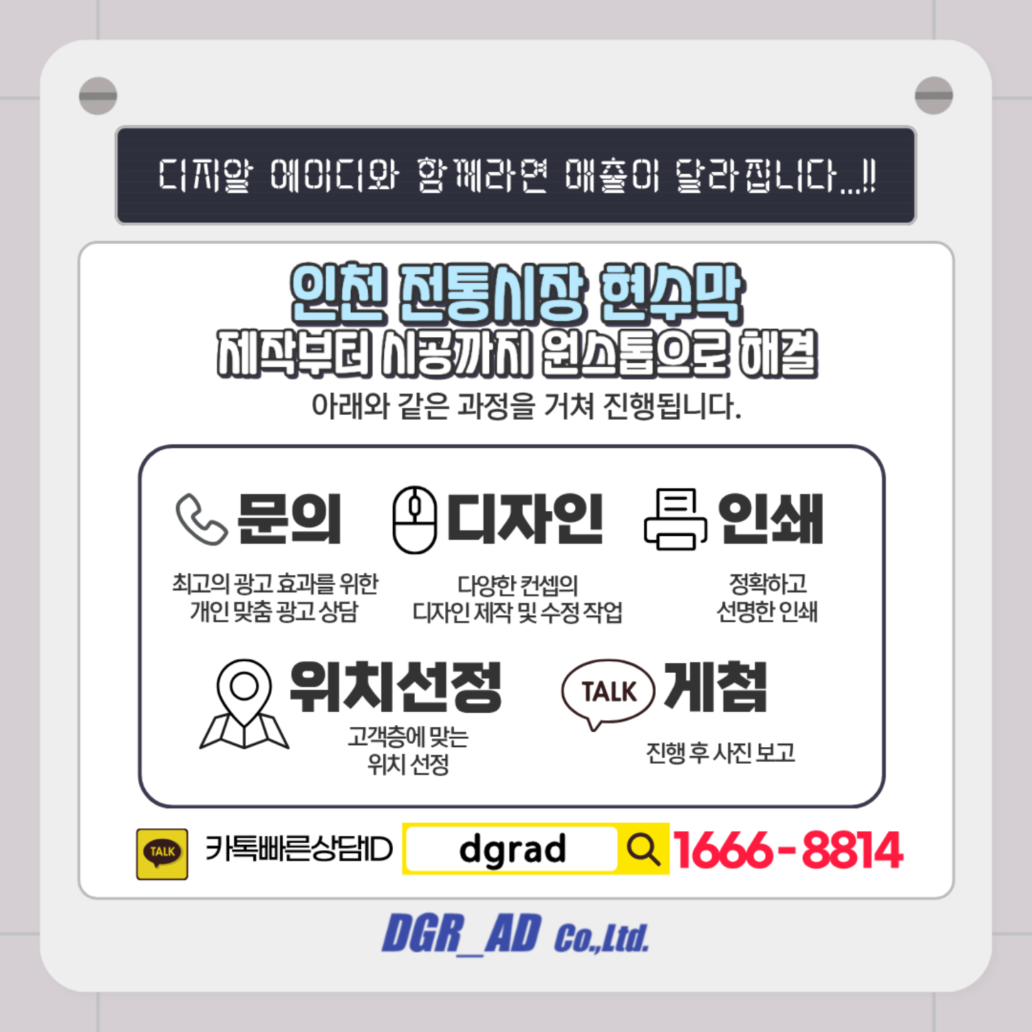 ‘인천 전통시장 현수막, 설치부터 시공까지’라는 문구는, 시장이라는 특수한 환경에 맞는 전문 ‘시공’ 기술이 필요함을 의미합니다. 시장 입구의 대형 현수막, 골목 벽면, 펜스 등 다양한 위치에 안전하고 튼튼하게 설치하는 것은 단순한 ‘제작’을 넘어선 영역입니다.