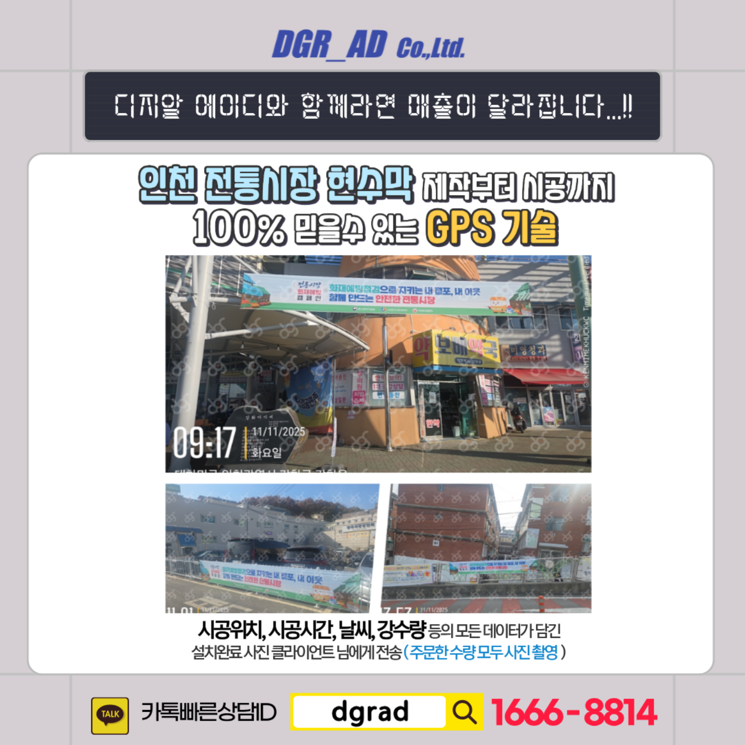이 이미지 속 실제 시공 사진처럼, ‘시공위치, 시공시간, 날씨’ 등이 담긴 GPS 인증 사진을 클라이언트에게 투명하게 전송합니다. 이를 통해 현장에 가보지 않아도, 모든 현수막이 약속대로 정확히 설치되었음을 100% 신뢰할 수 있습니다.