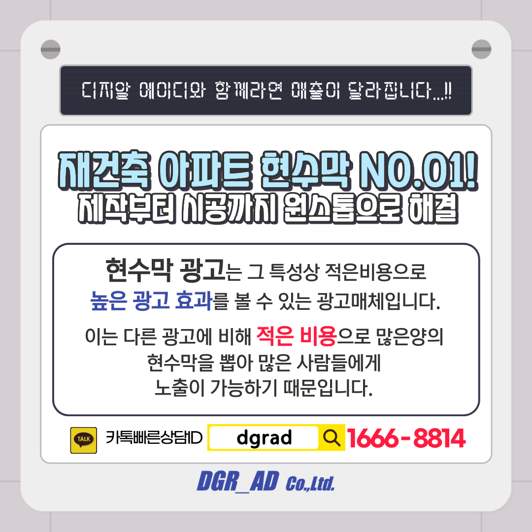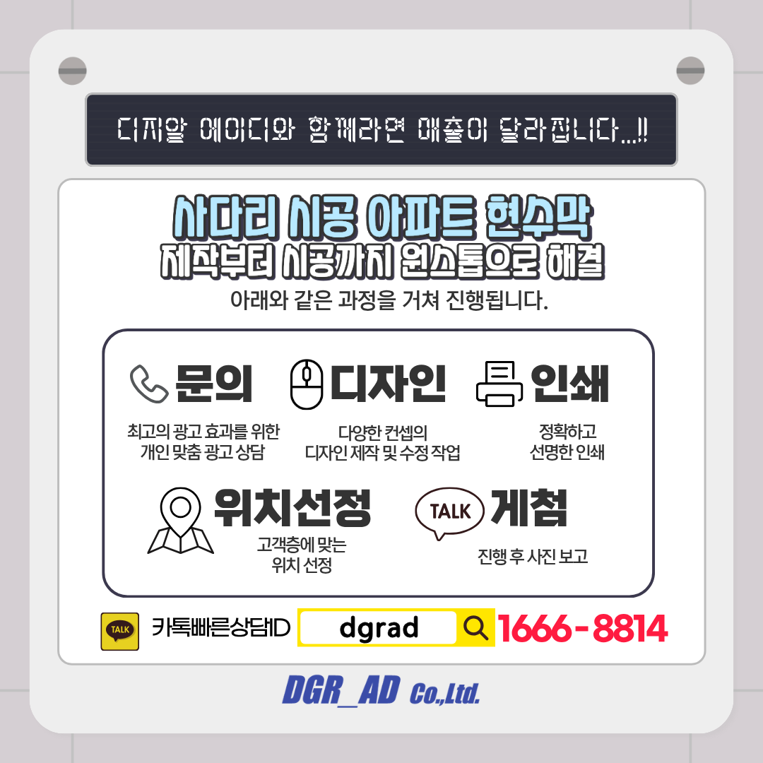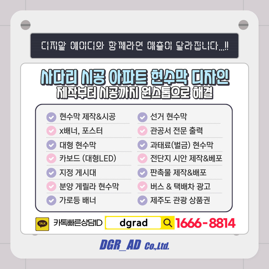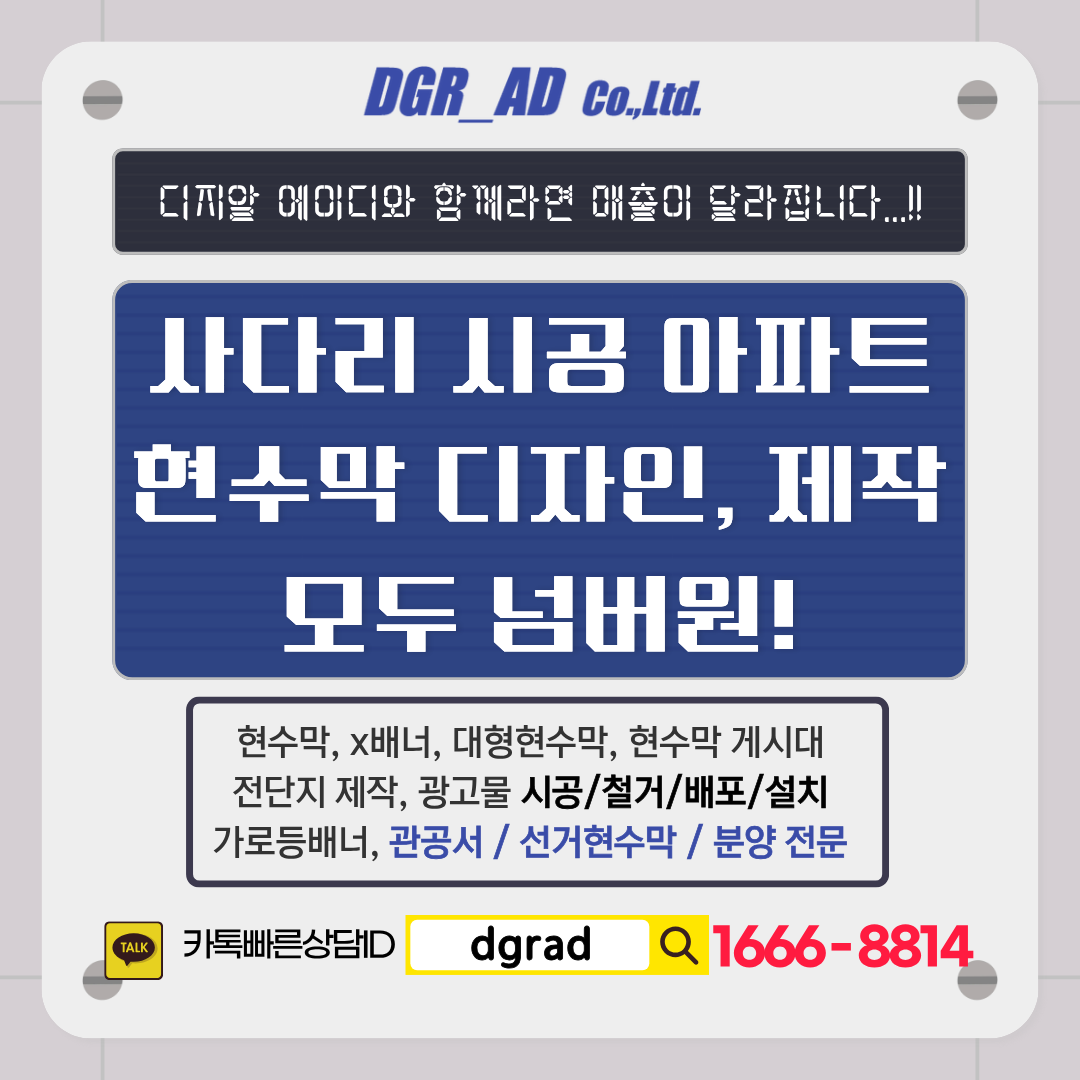 아파트 현수막 광고의 A to Z를 믿고 맡길 수 있는 업체를 찾으신다면, 디지알에이디가 정답입니다.